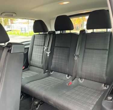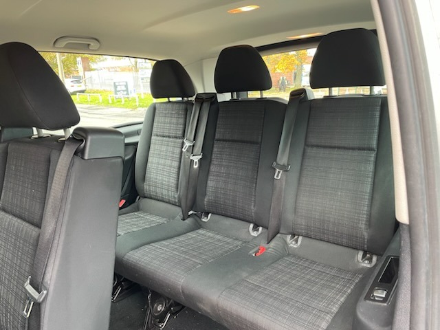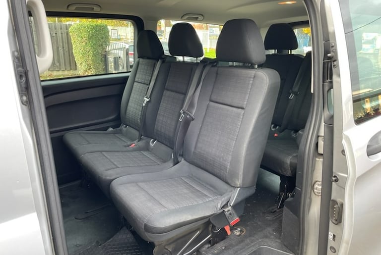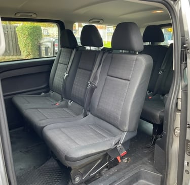 The Mercedes Vito seats 8 passengers and again with full 3 point seatbelts to every seat, with the Mercedes quality seating and style.