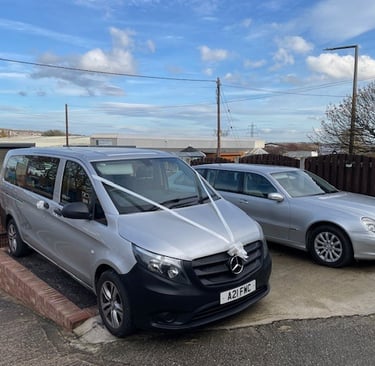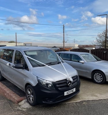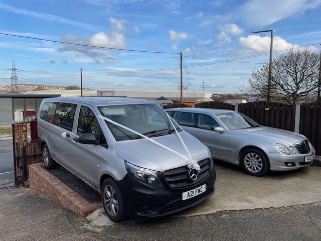 Our Mercedes limousine and our Mercedes Vito tourer, both finished in silver.